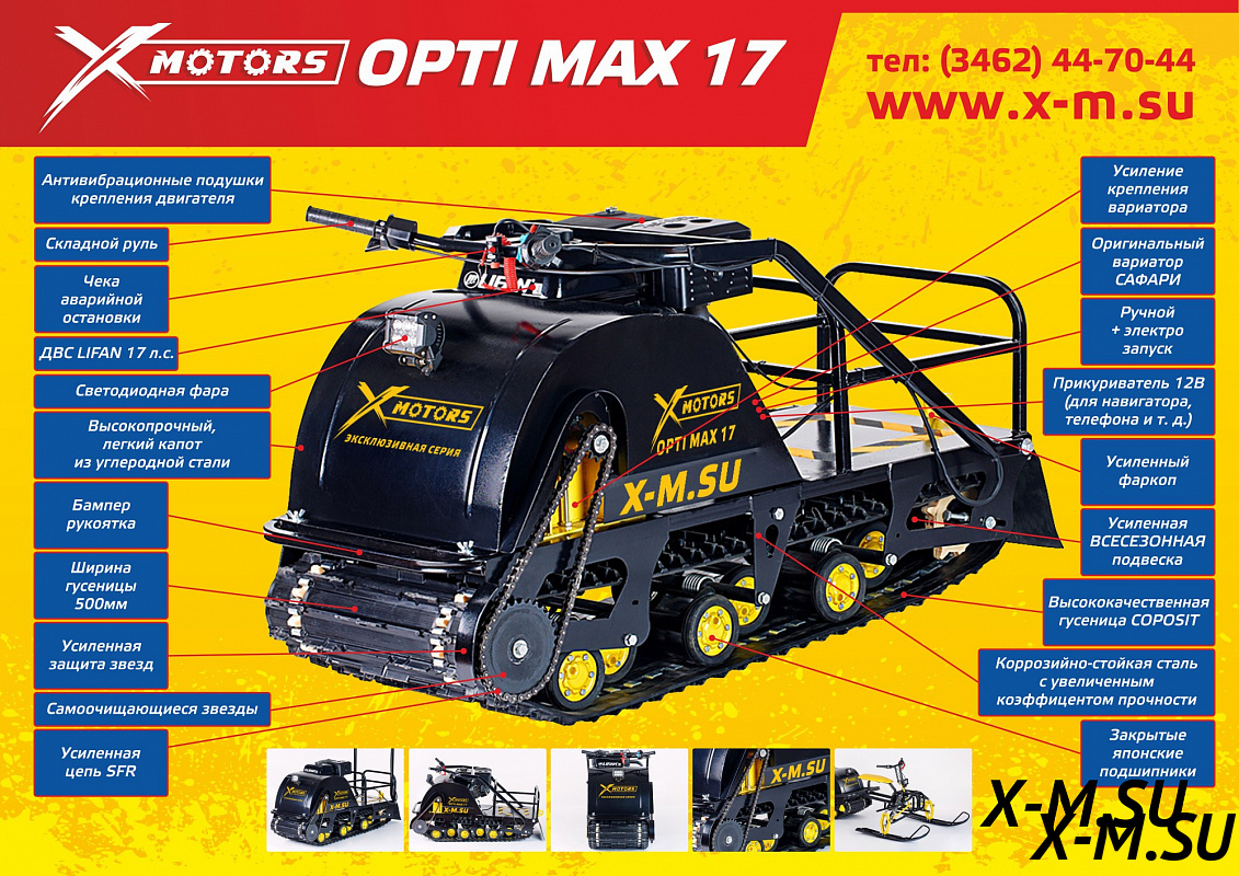 Купил OPTI MAX 17, всё супер! Мощный движок (Lifan 17 л.с.), едет отлично, реверс работает как часы. Подогрев ручек - руки в тепле, даже в лютый мороз. Какая-то проблема с описанием, всё равно работает отлично. Качество сборки на высоте, всё чётко. Рассрочка 0% - это бомба, оплачиваю потихоньку. В общем, аппарат - бомба! Рекомендую к приобретению!
